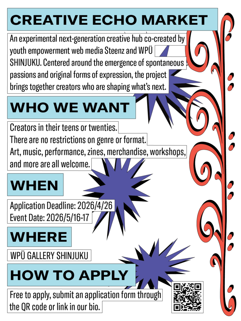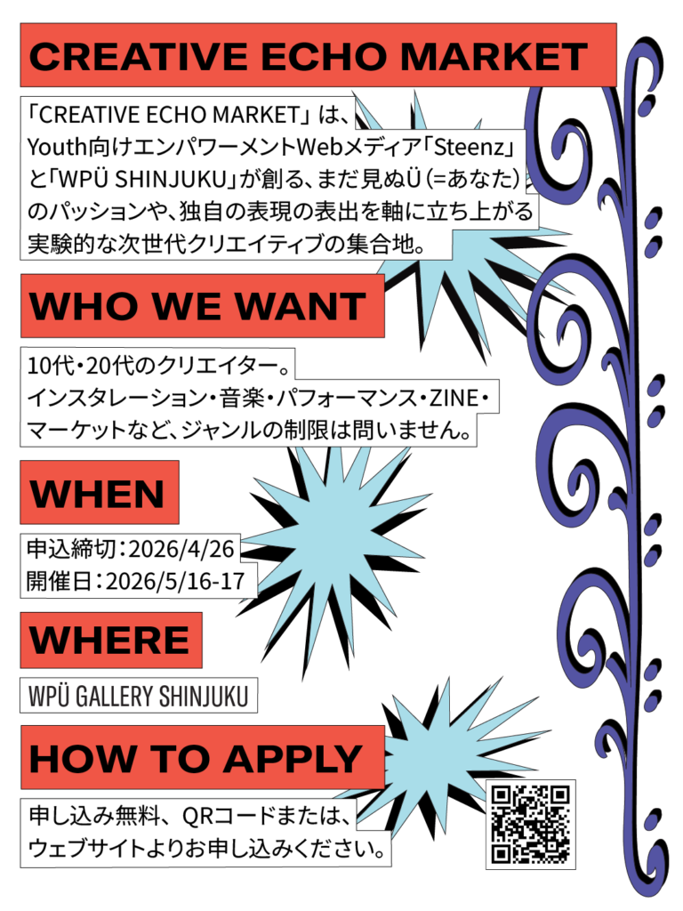 CREATIVE ECHO MARKET is an experimental gathering space for next-generation creativity, co-created by youth empowerment media platform Steenz and WPÜ SHINJUKU. It is a place that brings to the surface unseen passions and unique forms of expression—Ü (= you). The stage is WPÜ SHINJUKU, located in Shinjuku—a place where movement and stay intersect. Here, expressions across disciplines—fashion, art, music, and physical performance—coexist on equal ground, each creating its own rhythm within the space. We do not require experience or perfection. What matters most is that your expression comes from a genuine desire—something you truly want to create and share, not for trends or consumption, but for yourself.